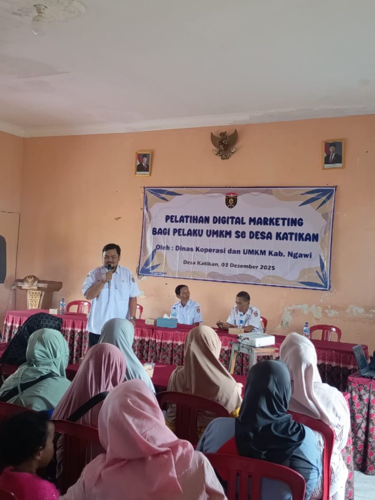 dinkop.ngawikab.go.id. Ngawi, Selasa, 9 Desember 2025. Dinas Koperasi Usaha Kecil dan Menengah Kabipaten Ngawi melalui Bidang Peningkatan SDM dan Transmigrasi menjadi narasumber dalam Pelatihan dengan tema “”DIGITAL MARKETING BAGI PELAKU UMKM SE DESA KATIKAN”. 3/12/2025. Mewakili Kepala Dinas Koperasi Usaha Kecil dan Menengah Kabupaten Ngawi Sumarsono S.H.,M.Si, JFT Pengembang Kewirausahaan Ahli Muda Bayu Mei Rimawan, S.Sos.,M.M, Pengembang Kewirausahaan Ahli Pertama Tahta Akbar Paramaartha, S.E dan Pengawas Koperasi Ahli Pertama Hurin Aghnia Nur Ainani, S.Ak. Acara berlangsung di aula Kantor Desa Katikan, Kecamatan Kedunggalar dan dihadiri oleh Kepala Desa, Perangkat Desa serta pelaku UMKM Se Desa Katikan. Acara dibuka oleh Kepala Desa Katikan. Dalam sambutannya disampaikan agar UMKM di Desa Katikan aktif mengikuti perkembangan jaman di era digital sekarang ini, termasuk meningkatkan penjualan melalui online, sehingga mengikuti pelatihan ini sangat penting untuk diterapkan.